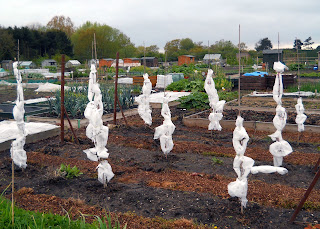 This time last year my early vine growth was stopped in its tracks by a cruel May frost. This year I have taken precautions and wrapped the vines in fleece. I had a peep behind the fleece this morning and I'm pleased to report that the vines are thriving. I'll leave the fleece in place until next weekend when, hopefully, all risk of frost will have passed and I will then look forward to a long hot Summer and a bumper harvest of grapes ready for pressing and fermenting.